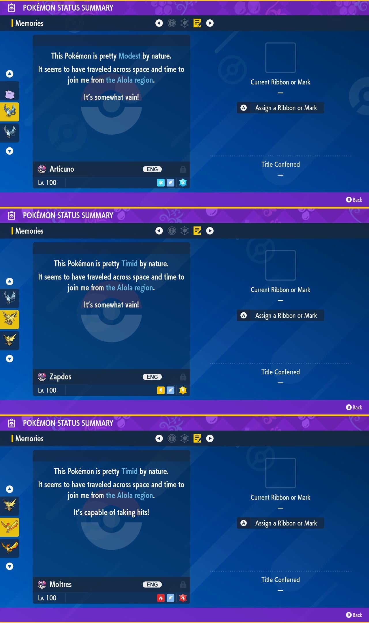 SHINY Articuno, Zapdos, Moltres Bundle Pack 6IV EV / Pokémon Scarlet and Violet / 6IV Pokemon / Shiny Pokemon / Free Shiny / EV Trained